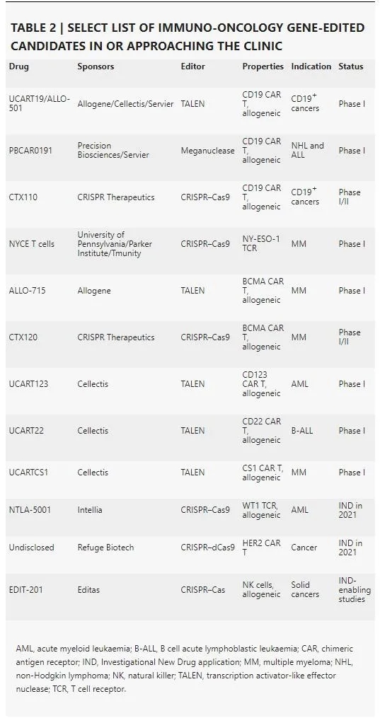 目前在癌症免疫疗法的研发管线中,基因编辑技术被用于进一步改善靶向CD19或BCMA抗原的CAR-T疗法,以及对同种异体细胞疗法进行改造,防止同种异体的T细胞对宿主组织进行攻击。