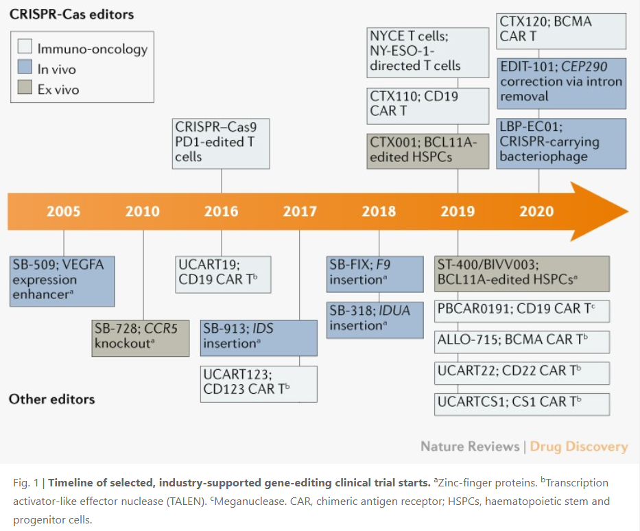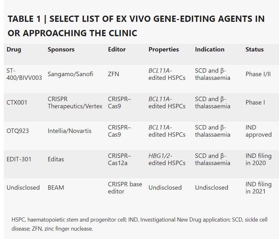 CRISPR Therapeutics 和 Vertex基于CRISPR-Cas基因编辑系统联合开发了CTX001,靶向编辑BCL11A基因,于2019年2月进入了临床研究,治疗同类疾病。2019年这两家公司报告了来自2名患者的初步安全性和有效性数据。