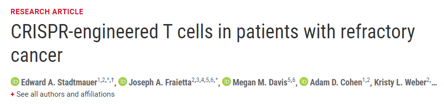 基因编辑技术提供了一种进一步改进CAR-T 疗法的策略。在2019年,宾夕法尼亚大学的 Carl June 教授(CAR-T 细胞疗法先驱之一)与合作伙伴一起,使用CRISPR-Cas9基因编辑技术敲除了T细胞中的内源T细胞受体和表达PD-1的基因。然后,他们将识别NY-ESO-1抗原(一种在多种肿瘤组织中高度表达的抗原)的T细胞受体表达在这些T细胞中。今年2月,研究团队在Science 杂志上发表了研究的初步结果。初步结果表明,经过基因编辑的T细胞没有导致与治疗相关的严重不良反应,而且显示出持久的存活和扩增能力。