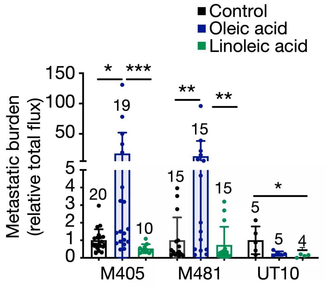 随后,研究人员就用油酸和亚油酸分别处理癌细胞,然后再注射到小鼠的血液中,结果油酸处理的癌细胞形成了更多的转移灶,而亚油酸和对照组一样,形成很少转移灶。这说明只有油酸有保护癌细胞免遭铁死亡的作用。