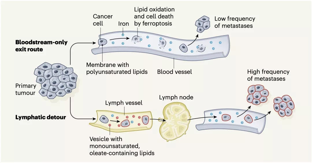 他们发现,进入淋巴的癌细胞,会摄取淋巴中富含的油酸,并镶嵌到细胞膜中,形成一个对抗氧化应激的保护层,待癌细胞从淋巴进入血液之后,癌细胞的细胞膜就无惧血液的高水平氧化应激,进而避免癌细胞发生铁死亡[1]。