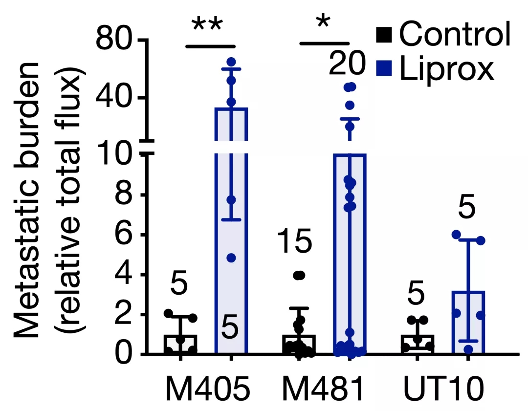 随后,Ubellacker利用铁死亡抑制剂(liproxstatin-1)和铁离子螯合剂分别证实了血液中的癌细胞确实是发生了铁死亡,而且铁死亡也确实影响了血液中癌细胞的转移效率。在注射进血液之前用铁死亡抑制剂处理癌细胞的话,可大幅提高癌细胞在远处形成转移灶的能力。