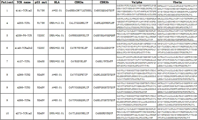 表2:TP53新抗原特异性TCR