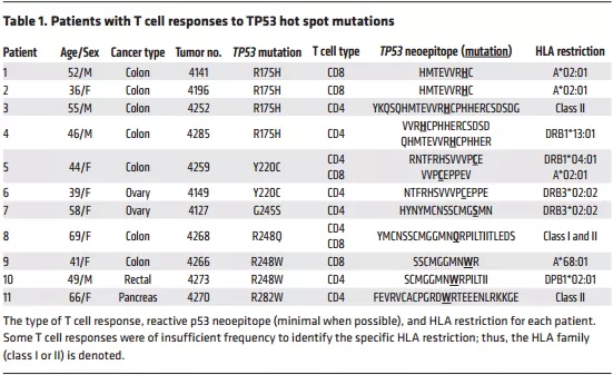 表1:对TP53热点突变有反应的患者
