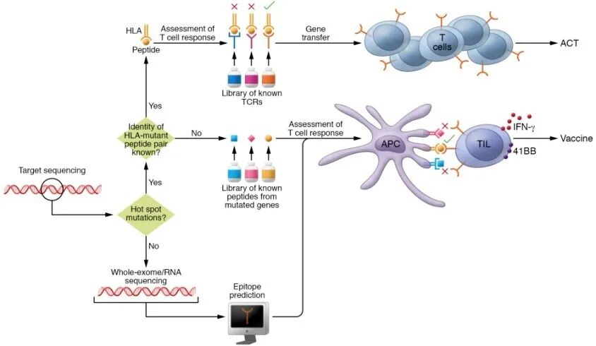 作者提供了一种快速的方法来筛选肿瘤新抗原用于后续免疫治疗。COSMIC数据库显示所有肿瘤类型中最常见的12种TP53热点突变为R175H, Y220C, G245S, G245D, R248L, R248Q, R248W, R249S, R273C, R273H,R273L, R282W。把每个T细胞热点突变构建为编码25个氨基酸肽的小基因或肽段(共25个氨基酸,中间为突变氨基酸,两侧为12个野生型氨基酸)。用串联小基因(TMGs)电穿孔或肽脉冲来自体外周血中未成熟的树突状细胞,并与TILs片段培养物共培养,以IFN-γ的分泌和CD137(41BB)的上调作为读数来评估患者TILs的新抗原反应性。一般情况下,从患者肿瘤标本中鉴定新抗原特异性T细胞的过程耗时34天,通过使用预先创建的文库中的肽刺激T细胞可以进一步加快整个过程。如果没有热点突变,则使用全外显子组/RNA测序和表位预测来鉴定新抗原的标准流程(图1)。