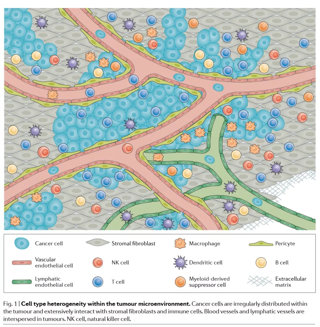 图1 肿瘤微环境中细胞类型的异质性 | 癌细胞不规则地分布在肿瘤内,并广泛地与基质成纤维细胞和免疫细胞相互作用。肿瘤中还散布着血管和淋巴管。