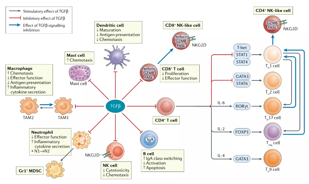 图5 TGFβ对免疫细胞群的作用 | TGFβ信号传导对不同的免疫细胞类型有重要影响,能够刺激或抑制多种免疫细胞的活性。TGFβ信号传导的药理和/或遗传抑制也可以影响特定的细胞类型。