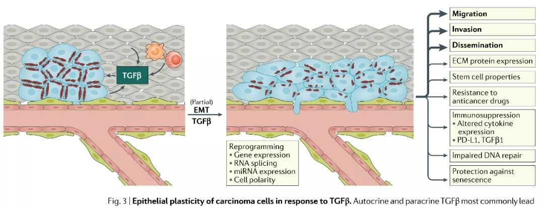 自分泌和旁分泌TGFβ最常见的是导致部分上皮-间质转化(EMT),这一过程涉及基因表达模式的广泛重编程以及细胞极性的转换。EMT相关的这些变化使细胞定向迁移和侵袭成为了可能,这是癌细胞扩散的先决条件。伴随着EMT相关的变化,癌细胞还能够获得干细胞样特性(stem cell-like characteristics),包括对治疗的耐药性增加、免疫抑制配体的表达和释放增加、阻止衰老的能力增加以及DNA修复能力降低(进而增强基因组的不稳定性)。