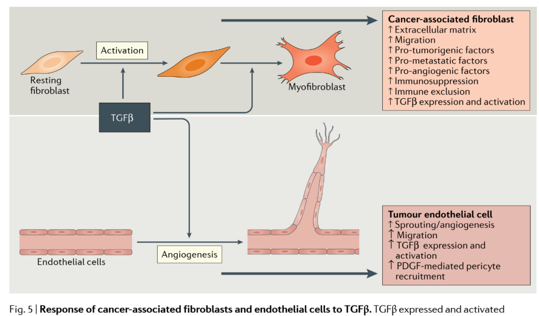 在肿瘤微环境中,肿瘤细胞或其他细胞表达和激活TGF因子,通过对肿瘤相关成纤维细胞和血管生成的作用,促进肿瘤进展