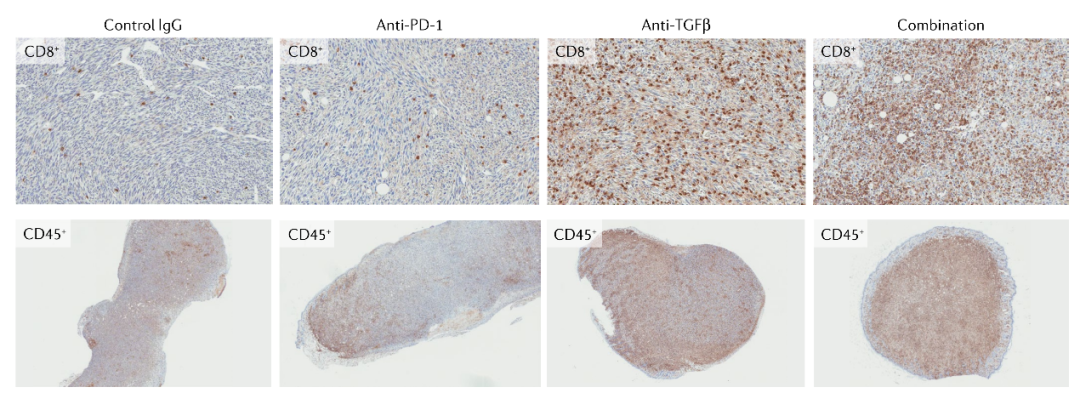 在本模型中,抗pd -1治疗导致CD8+和CD45+细胞增多,主要分布在肿瘤皮质内,向肿瘤核心浸润较少。相比之下,抗tgf治疗使得CD8+和CD45+细胞在整个肿瘤浸润更加均匀。两种药物协同作用,导致60%的肿瘤完全排斥和获得持久免疫(未显示)。