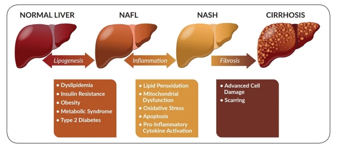 非酒精性脂肪性肝病(NAFLD)是肝细胞中脂肪过度堆积而导致的慢性肝病。随着肥胖及其相关代谢综合征的全球化流行,NAFLD已成为慢性肝病的重要病因,全球范围内NAFLD患者约占总人口的25%,其中15%~25% NAFLD患者发展为NASH,并随着症状的持续,约15% NASH患者进一步发展为肝硬化及肝癌,增加死亡风险。目前中国NASH患者约为4000万人,美国约为1500万人。尽管全球范围内NAFLD/NASH患者数量增长居高不下,但迄今为止NASH领域没有获准上市的治疗药物。