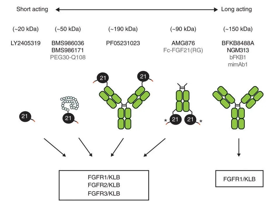 FGF即成纤维细胞生长因子,是一组具有保守结构域的信号蛋白,参与胚胎发育,组织再生和代谢稳态维持等。作为FGF家族的一员,FGF21是调节糖脂代谢的重要内分泌因子。动物水平的基础研究证明,FGF21通过促进脂肪酸氧化及抑制脂质新生,缓解肝脏脂肪变性,逆转或延缓肝脏炎性病变及纤维化发生发展。然而天然FGF21短暂的体内半衰期(0.5~2h)和较差的物化特性,限制了其作为候选药物。同时为了实现工业化生产及临床应用,只有通过改造FGF21以保留生物学活性并规避结构缺陷。全球范围内已有多家知名药企围绕FGF21开展研发布局多年,通过对FGF21进行点突变、PEG或Fc等长链融合、scaffold融合以及模拟抗体等技术修饰,开发出数款长效FGF21类似物。目前还没有FGF21药物上市,LY2405319、BMS986036、PF05231023、AKR-001、NGM313等产品均处于临床I-II期阶段。