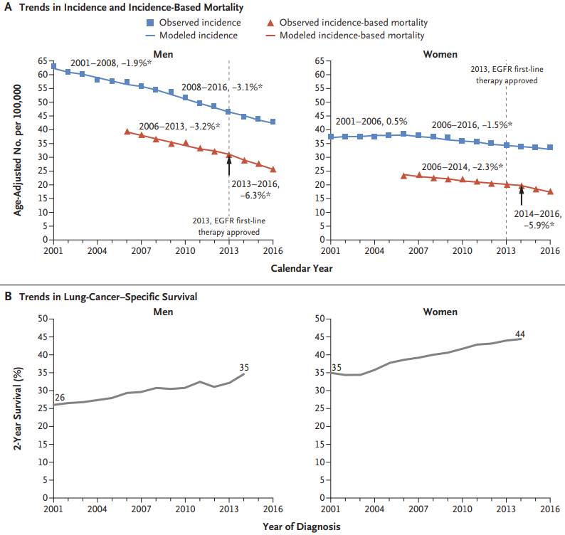 本次由美国国家癌症研究所(NCI)牵头进行的分析,调取了SEER数据库自2001年以来的统计资料,大约覆盖了美国28%人口的癌症发病和死亡情况。而分析的主要结论,就是前面提到的肺癌死亡率“大幅下降”,但获益仍然以NSCLC为主。