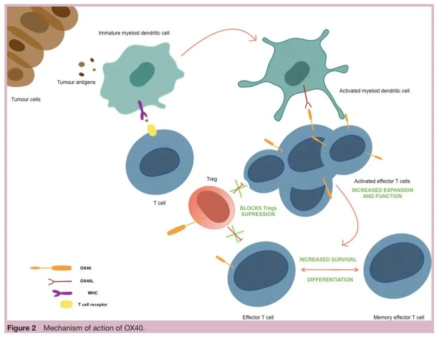 T细胞活化:OX40诱导具有抗凋亡(Bcl-2、Bcl-xl和Bfl-1)和细胞周期进展特性(Survivin)的蛋白质的表达。OX40可抵消免疫细胞(包括CD4+和CD8+T淋巴细胞、NK细胞和B淋巴细胞)的抑制,同时直接刺激效应T细胞。