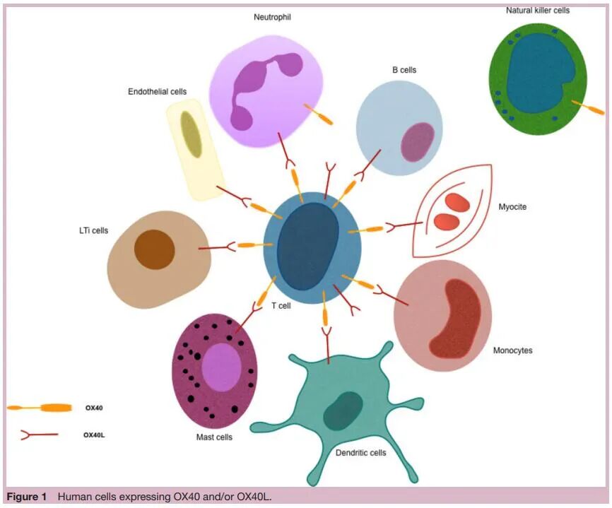 OX40是一种1型跨膜糖蛋白,主要由T细胞表达(结构性地由调节性T细胞表达,激活后由效应T细胞表达)。OX40的配体为OX40L,最初发现于HTLV-1转换的T细胞,被称为pg34,主要表达于APC,在NK细胞、肥大细胞和激活的T细胞上也有表达。下图显示了表达OX40和OX40L的人类细胞及其潜在的相互作用,允许活化的T细胞在炎症信号后迁移到组织中。