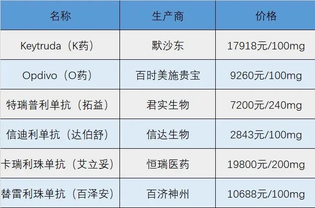 两款进口PD-1与四款国产PD-1形成了国内PD-1单抗的“4+2”竞争格局。面对硝烟四起的PD-1单抗市场,进口和国产厂家起初都希望通过低价占据先机,例如百时美施贵宝的Opdivo(俗称“O药”)和默沙东的Keytruda(俗称“K药”)售价均约为美国定价的一半,在几乎全球范围内都属于低价。