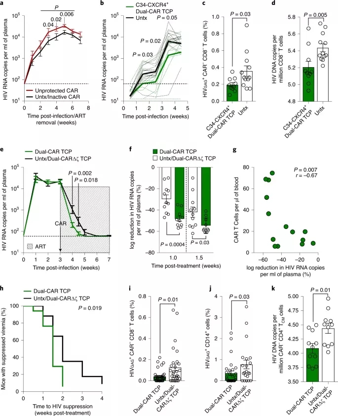 在使用这种双特异性CAR-T细胞治疗感染HIV的小鼠时,研究小组发现,与未接受治疗的动物相比,感染小鼠经双特异性CAR-T细胞治疗后,体内的HIV复制较慢,被HIV感染的细胞更少。并且治疗减少了小鼠血液中的病毒数量,CD4+T细胞(HIV的首选靶细胞)也得以保留。另外,当研究人员在HIV感染的小鼠中将双特异性CAR-T细胞与抗逆转录病毒疗法结合使用时,更快地抑制了病毒,而且病毒库比仅用抗逆转录病毒疗法治疗的小鼠更小。