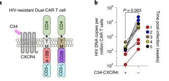 此外,研究人员还为T细胞添加了C34-CXCR4,这种蛋白质可防止HIV附着感染T细胞。最终产生的长效CAR-T细胞能响应HIV感染,有效杀死受感染的细胞,而且自身对HIV感染也具有部分抵抗力。