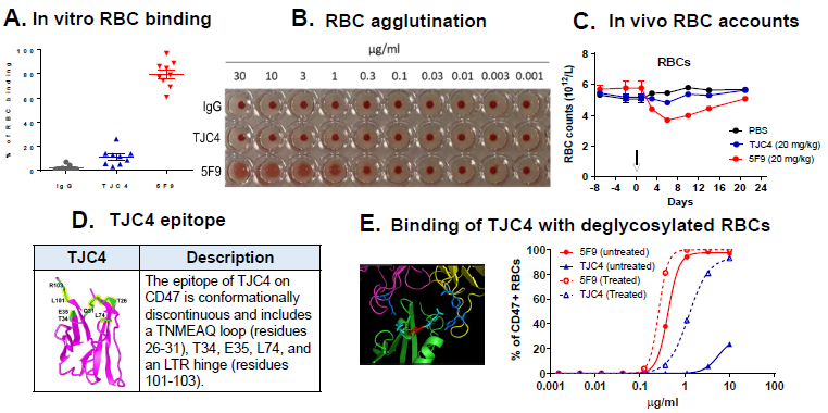 (A)与Forty Seven公司的CD47单抗5F9相比与人红细胞结合更弱。(B) TJC4不会引起凝血。(C)20mg/kg剂量单次注射,TJC4对食蟹猴红细胞计数的影响更小。(D)晶体结构分析TJC4的抗原结合表位。(E)红细胞去糖基化会增加与TJC4的结合。