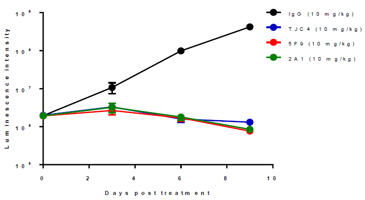 2020年9月,在与艾伯维签订战略合作协议时,天境生物透露的TJC4的美国I期临床研究初步结果显示其在安全性方面的差异化优势以及更优异的药代动力学性质。TJC4单药注射给药从1mg/kg至30mg/kg剂量范围显示出良好的耐受性,且在可评估患者中未观察到剂量限制性毒性(DLT)或严重的血液不良事件。具体的实验结果将于2020年下半年在相关国际学术会议上公布。虽然临床试验结果尚未公布,但在NSG小鼠Raji淋巴瘤细胞移植模型中的试验显示TJC4与Forty Seven公司的5F9、鼠源抗CD47单抗2A1在10mg/kg剂量下具有基本一致的抗肿瘤活性。(图表4)