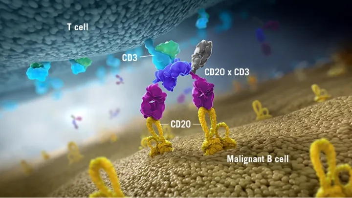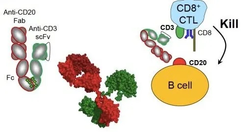 罗氏的另一款CD20/CD3双抗Mosunetuzumab不同于glofitamab,有两个Fab段,其中一个Fab靶向CD20,另一个靶向CD3。