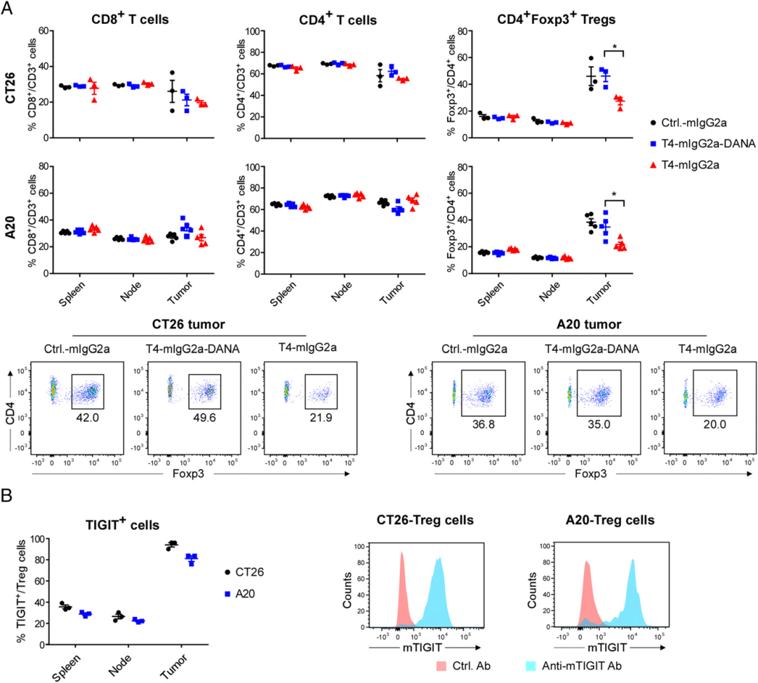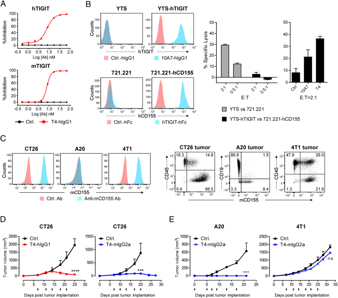 隋建华课题组筛选了一株命名为T4的TIGIT抗体,可以同时结合人、小鼠的TIGIT。小鼠模型内, T4表现出抗肿瘤活性(具备Fc effector效应的人IgG1或小鼠IgG2a亚型)。