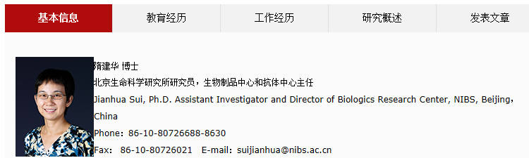 隋建华为北生所研究所、生物制品中心和抗体中心主任。从2000年到20011年的12年间,包括四年博士后生涯和八年讲师生涯,隋建华都在Dana-Farber癌症中心度过。2012年,隋建华回国加入北生所。