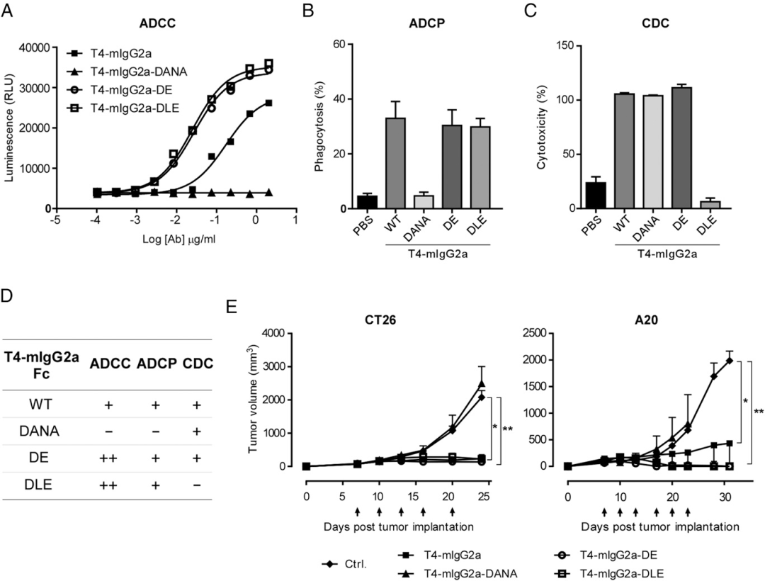 为探究Fc effector对于T4抗体抗肿瘤活性的影响,研究人员构建了3种突变体,分别为去除Fc effector效应的DANA(D265A/N297A),增强ADCC活性并保留ADCP活性和CDC活性的DE(S239D/I332E),以及增强ADCC去除CDC活性的DLE(S239D/A330L/I332E)。结果表明,DE和DLE表现出更强的抗肿瘤活性(DLE更强),DANA几乎没有抗肿瘤活性。说明ADCC对于TIGIT抗体的抗肿瘤活性至关重要,CDC则不需要。