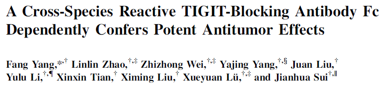 2020年9月8日,北京生命科学研究所隋建华课题组在Journal of Immunology期刊上发表文章,筛选了一种人、鼠交叉反应的TIGIT抗体,并重点探讨了Fc effector效应对于抗肿瘤活性的影响和具体机制。