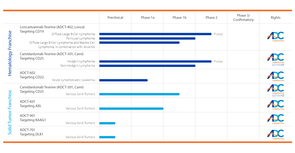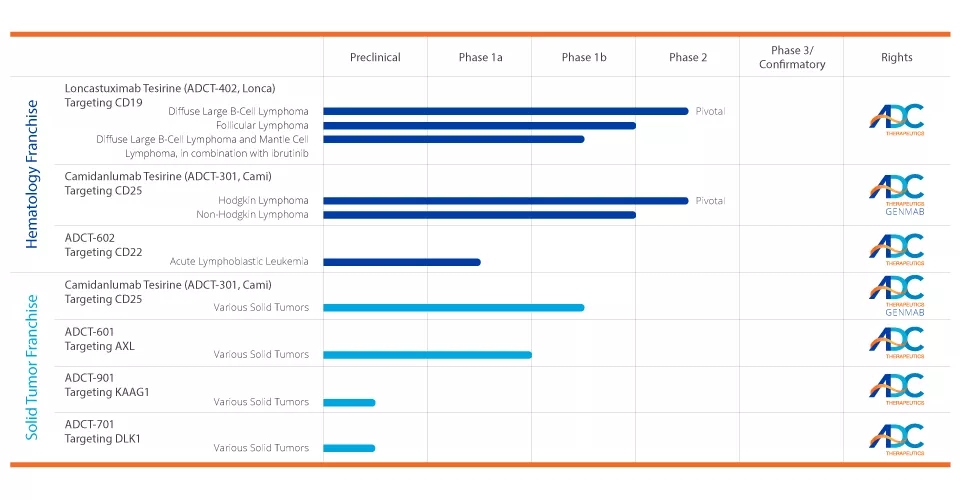 针对基于PBD的ADC的战略目标选择和早期临床开发的大量投资,ADC Therapeutics建立了一个治疗血液学恶性肿瘤和实体肿瘤的治疗的深度临床和研究管道。在美国和欧洲,该公司有多个基于PBD的ADC正在进行临床试验,从首次人体试验到关键的2期临床试验,以及其他正在开发的临床前ADC。ADCT-402和ADCT-301是该公司的两个主要候选产品。