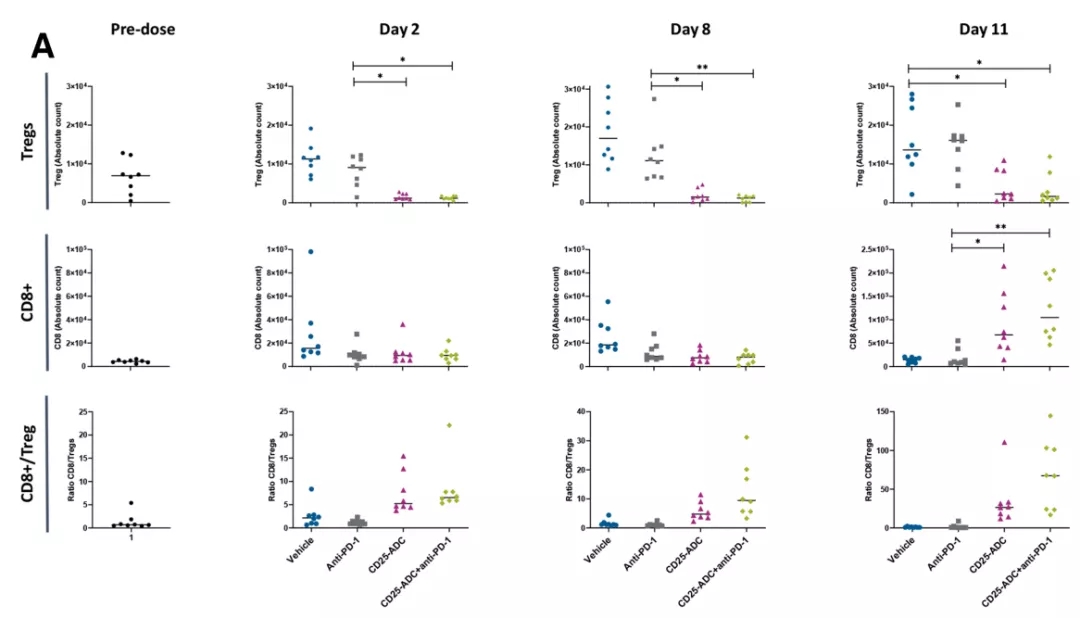 重要的是,CD25 ADC能够显著和持续的介导肿瘤微环境内Tregs的耗尽,并且伴随着CD8 + T效应细胞大量的激活和增加,并且全身性的Tregs耗尽是暂时的,减轻了自身免疫副作用的风险。