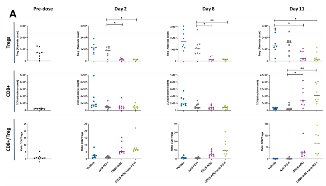 研究中,研究人员建立了CD25阴性的同基因结肠癌模型(表现为表达CD25的Tregs肿瘤浸润),然后输注单次低剂量的Cami单药或/联合PD-1免疫检查点抑制剂。结果显示:单次低剂量的Cami单药或/联合PD-1都能对该模型产生有效且持久的抗肿瘤活性;CD25 ADC的肿瘤杀伤依赖于CD8+ T细胞,CD25 ADC诱导了肿瘤免疫。