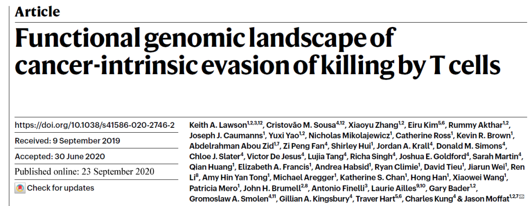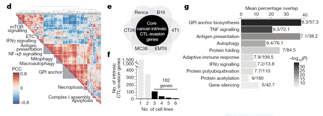 研究人员把这些细胞系与已经被激活的细胞毒性T细胞(CTL)放在一起,观察哪些基因在敲除之后会让癌细胞对CTL更为敏感,而哪些基因在敲除之后让癌细胞能够对CTL的攻击产生抗性。筛查的结果发现了182个基因,这些基因在3种以上的细胞系中表现出相同的能力,能够让癌细胞对CTL的杀伤作用更为敏感或更具有抗性。研究人员称这些基因为“核心癌症固有免疫逃逸基因”(core cancer intrinsic immune evasion genes)。