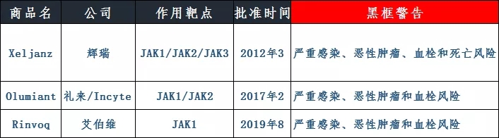 安全性问题一直是JAK抑制剂研发的最突出挑战,已经获批上市的产品多款JAK抑制剂都曾面临着不同程度的安全性问题,FDA批准的3款用于治疗类风湿性关节炎的JAK抑制剂在说明书中都附有黑框警告。