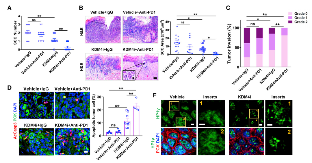 总的来说,这项研究结果表明,靶向抑制KDM4A,可以通过加重鳞状细胞癌细胞中的复制压力来激活抗肿瘤免疫力,并增强PD-1抑制剂的免疫治疗效果。
