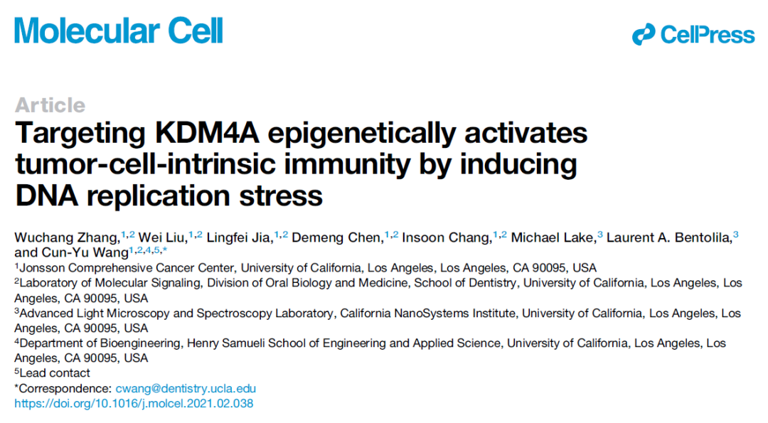 近日,加州大学洛杉矶分校(UCLA)王存玉院士团队在 Cell 子刊 Molecular Cell 发表了一项题为:Targeting KDM4A epigenetically activates tumor-cell-intrinsic immunity by inducing DNA replication stress 的研究论文。