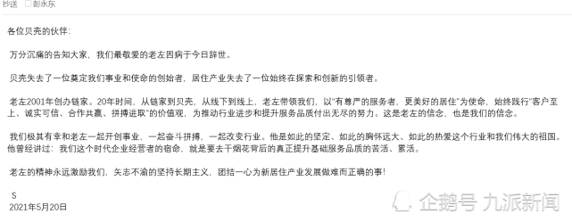 5月20日,贝壳找房发布公告,公司创始人兼董事长左晖先生因疾病意外恶化于2021年5月20日去世。