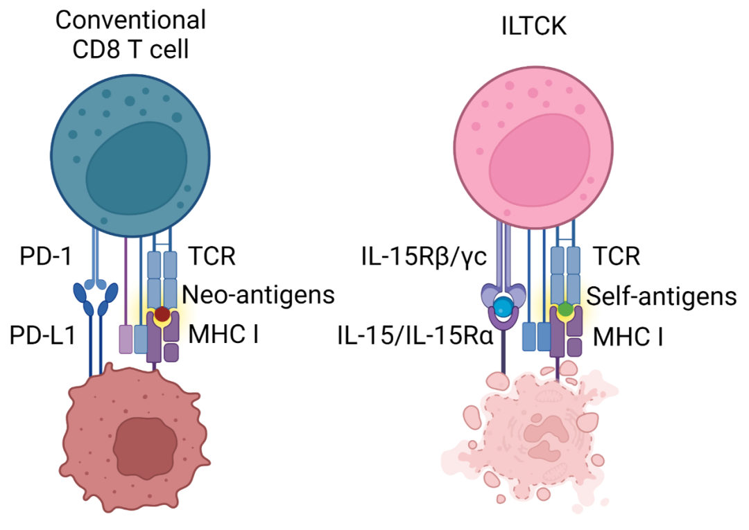 研究团队发现 ILTCK 并非分化于初始(naïve)CD8 T 细胞,而是独立于传统 T 细胞的另一细胞谱系。在 T 细胞分化过程中,绝大部分能够识别宿主原生抗原的T细胞通常能被有效地移除进而避免自体免疫疾病。然而 ILTCK 识别自体原生抗原的特性却是该细胞谱系分化的关键信号,但此分化机制能够永久抑制 ILTCK 中 T 细胞受体的下游信号传递。因此,广泛存在的 ILTCK 并无法引发自体免疫疾病,反而能够在原生抗原遍布的肿瘤内免于细胞耗竭。