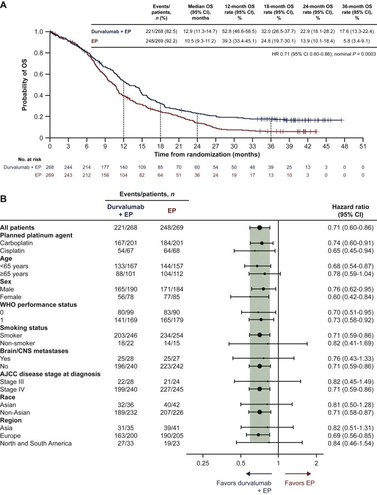 III期CASPIAN研究中,与依托泊苷+顺铂/卡铂(EP)单药相比,免疫联合治疗组(Durvalumab联合EP一线治疗)显著改善了广泛期小细胞肺癌(ES-SCLC)的总生存期(OS)。