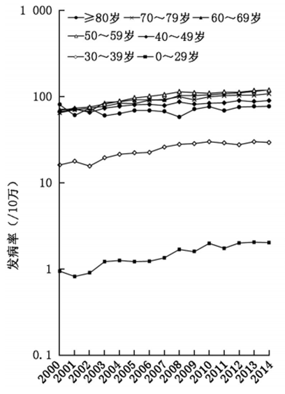 2000—2014年中国肿瘤登记地区女性乳腺癌发病趋势及年龄变化情况分析 虽然年龄大的女性风险更大,但40岁以下,甚至30岁以下人群的发病率在持续增加。