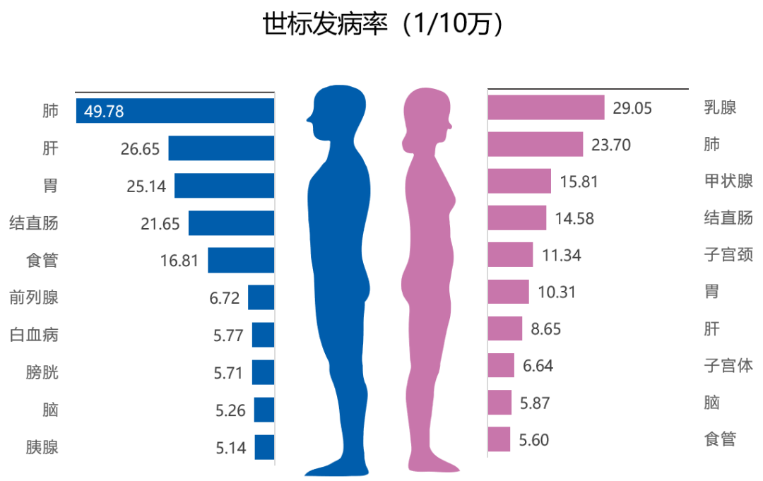 2020年中国女性新发癌症病例数209万,占总数的46%,乳腺癌、肺癌、结直肠癌发病人数最多。