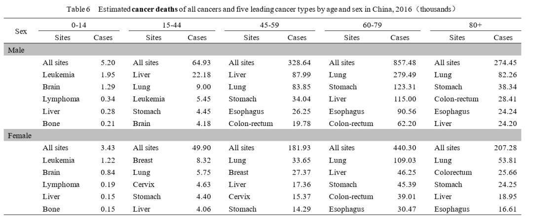 2020年中国癌症死亡人数前十的癌症分别是:肺癌71万,肝癌39万,胃癌37万,食管癌30万,结直肠癌29万,胰腺癌12万,乳腺癌12万,神经系统癌症7万,白血病6万,宫颈癌6万,这十种癌症占癌症死亡总数的83%。