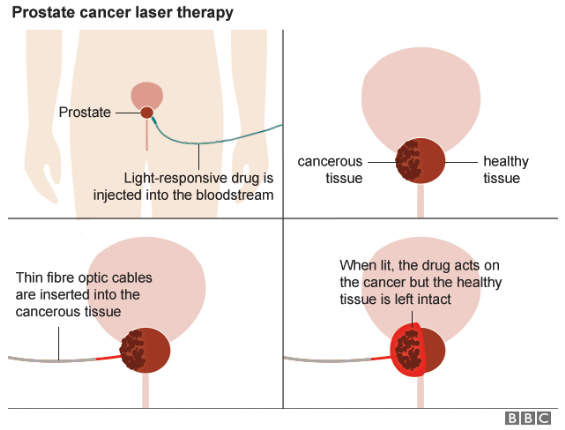 共有413名患者加入了该试验。新疗法使用了一种药物,这种药物由深海底黑暗处的细菌制成,只有暴露于光线下才会产生毒性。研究人员将光纤激光器通过会阴插入到癌变的前列腺中,当红色激光接通时,它会激活药物杀死癌细胞,对健康的前列腺不产生影响。