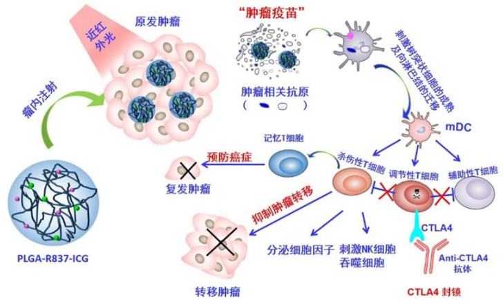 具体来说,他们首先利用三种FDA批准的分子:吲哚花青绿(ICG,光热剂)、咪喹莫特(R837,Toll样受体7刺激剂)和聚(乳酸-乙醇酸)(PLGA)合成了PLGA-ICG-R837的纳米颗粒。这种PLGA-ICG-R837颗粒注射到肿瘤部位,在近红外光的照射下不仅能有效地消除原发性肿瘤,同时释放出的多种肿瘤相关抗原并与R837一起发挥类癌症相关“疫苗”的作用。再加以免疫检验点抑制剂CLTA4抗体(以阻断免疫抑制性Treg细胞的作用),该“疫苗”的抗肿瘤效果则会被进一步增强。在与免疫检验点抑制剂anti-CTLA4的联合使用下,这种在体产生的癌症相关“疫苗”诱导的免疫应答能够有效地抑制肿瘤细胞的转移,并在多种肿瘤模型上取得了很好的治疗效果。更令人兴奋的是,在实验中,利用PLGA-ICG-R837光热效应消除第一个肿瘤40天后接种第二个肿瘤,同时给小鼠静脉注射抗anti-CTLA4抗体。我们发现,利用PLGA-ICG-R837光热效应消除第一个肿瘤和anti-CTLA4的联合使用,小鼠的第二个肿瘤有明显的抑制。因此利用光热效应消除原发肿瘤产生癌症“疫苗”在小鼠上能产生强烈免疫记忆效应。