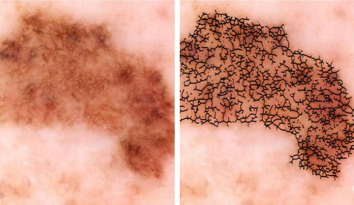 研究人员通过将60张癌症黑素瘤照片和等量的良性生长的照片提供给图像处理程序来开发这种工具。他们开发了成像生物标志物来精确量化视觉特征。使用计算方法,他们产生了一组定量度量,这在两组图像之间不同,并给予每个生物标志物恶性评级。