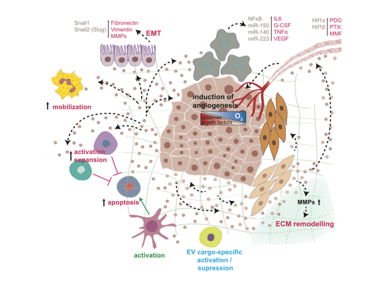 肿瘤EVs会使成纤维细胞分化成肌成纤维细胞,其释放MMP并导致细胞外基质(extracellular matrix,ECM)的重塑。 ECM的分解会导致ECM中的生长因子的释放并促进实质细胞的侵袭能力。肿瘤EVs激活肿瘤相关巨噬细胞并分泌G-CSF、VEGF、IL-6和TNF-α,它们一起促进血管生成并产生炎性细胞。肿瘤EVs影响免疫系统稳态,主要是通过免疫抑制的变化来保护肿瘤。肿瘤EVs激活和增加Tregs和MDSCs,抑制CD8+ T细胞介导的靶向肿瘤的免疫作用。此外,肿瘤EVs在其膜上表达FasL和TRAIL,并直接诱导CD8+ T细胞的凋亡。肿瘤EVs增加嗜中性粒细胞并且与肿瘤进展的增加相关。在肿瘤免疫中起重要作用的NK细胞可以被肿瘤EVs激活或抑制,这取决于研究的肿瘤模型和EVs的内容物。DCs可以被肿瘤EVs递送的肿瘤来源的抗原激活,并且参与CD8+介导的抗肿瘤反应。随着肿瘤的生长,其进展代谢需求会超过其血液供应,从而变得越来越缺氧。为了适应低氧,肿瘤会分泌能够促进血管募集的血管生成因子和EVs。源自原发性肿瘤的EVs可以刺激上皮细胞释放与EMT相关的因子,会使肿瘤细胞粘附(纤连蛋白和波形蛋白)、ECM重塑和血管生成(MMPs)的丧失,促进肿瘤细胞释放到体循环中并将它们传播到远端。