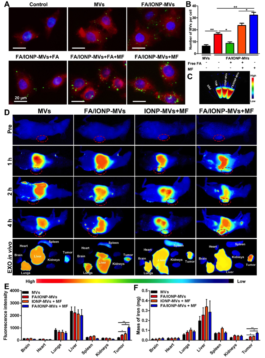 图3. 磁/叶酸修饰的囊泡具有较强的肿瘤靶向性。