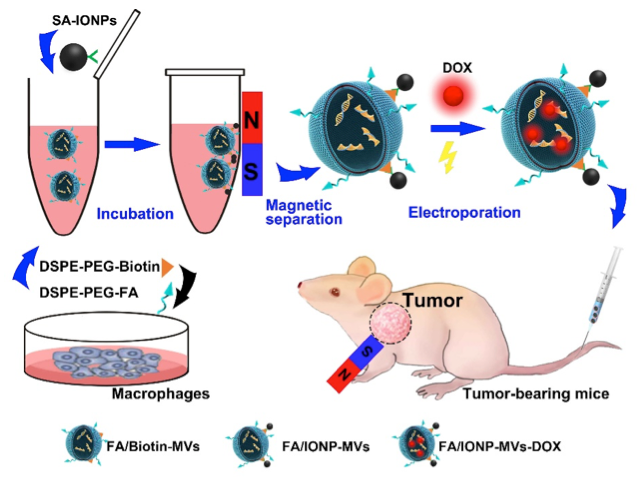 图5. 磁/叶酸修饰的囊泡作为肿瘤靶向治疗的载体。