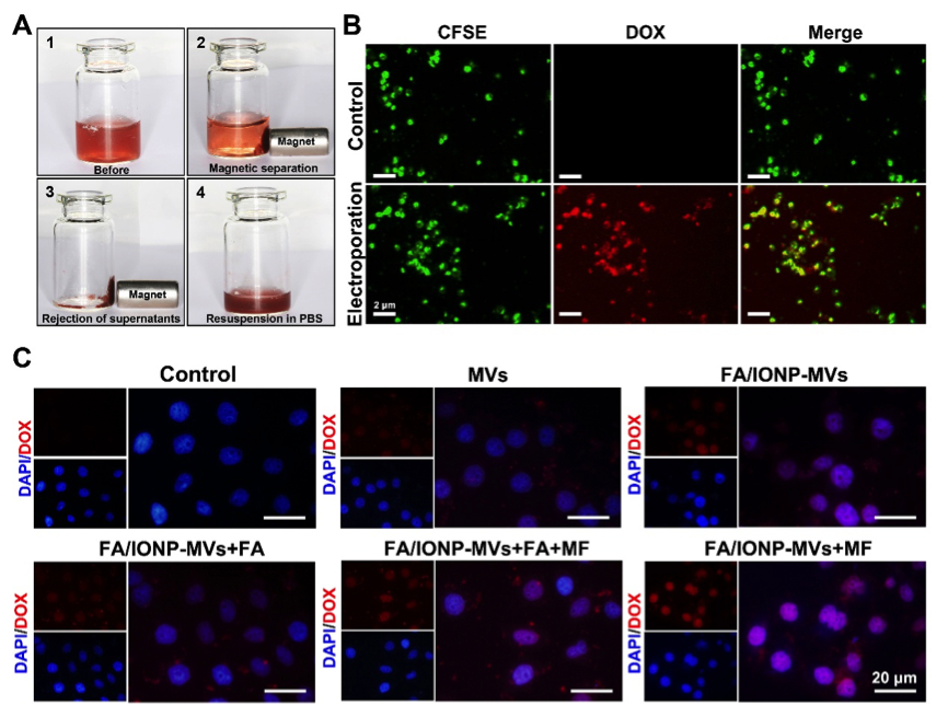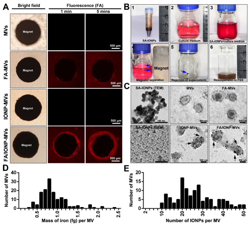 细胞源性囊泡(MVs)是细胞膜出芽、脱落产生的囊性结构,是细胞间传递生物大分子的天然载体。鉴于其天然的运载属性和良好的生物安全性,细胞源性囊泡被认为是极具前景的药物运载平台,也是近年来肿瘤药物运载领域的研究热点。然而,细胞源性囊泡的获取依赖于超高速离心,该方法繁琐、耗时,且受限于昂贵的超高速离心设备。因此,限制细胞囊泡其在临床治疗中的大规模应用。此外,细胞源性囊泡本身靶向肿瘤的能力较弱,难以在肿瘤部位选择性富集。利用赵怡芳课题组先前发明的 “生物膜磷脂嵌合”策略,他们提出了一种新的细胞囊泡分离、富集和靶向修饰的方法。首先,收集经生物素化的巨噬细胞的培养上清;然后,利用链霉亲和素偶联的磁性纳颗粒(SA-IONPs)与细胞囊性囊泡表面生物素的特异性结合,在外界磁场作用下,将细胞源性囊泡自培养上清中分离、富集,从而得到纳米磁颗粒和叶酸双重修饰的细胞源性囊泡。该囊泡具有极强的靶向肿瘤的能力,将抗肿瘤药物载入后,可发挥强有力的肿瘤杀伤效应。总之,本研究提供了一种新的细胞囊泡分离、富集和靶向修饰的方法,实现了对细胞源性囊泡的大规模、快速、简便的分离和制备,并同时赋予这些天然载体良好的肿瘤靶向性,极大推动了细胞源性囊泡作为药物载体在肿瘤治疗领域的应用。
