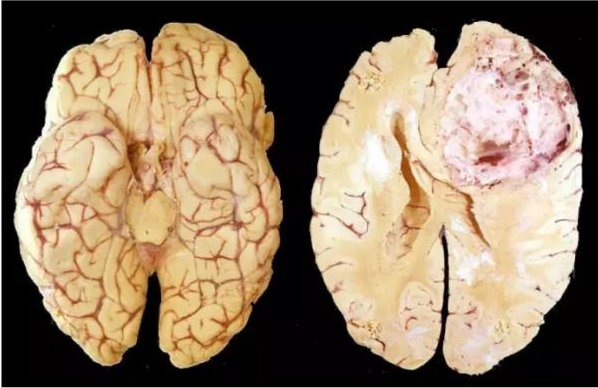 白色小圆片就是植入脑中的覆有化疗药物的晶片,位于瘤细胞之上,可以持续释放药物,进行局部化疗